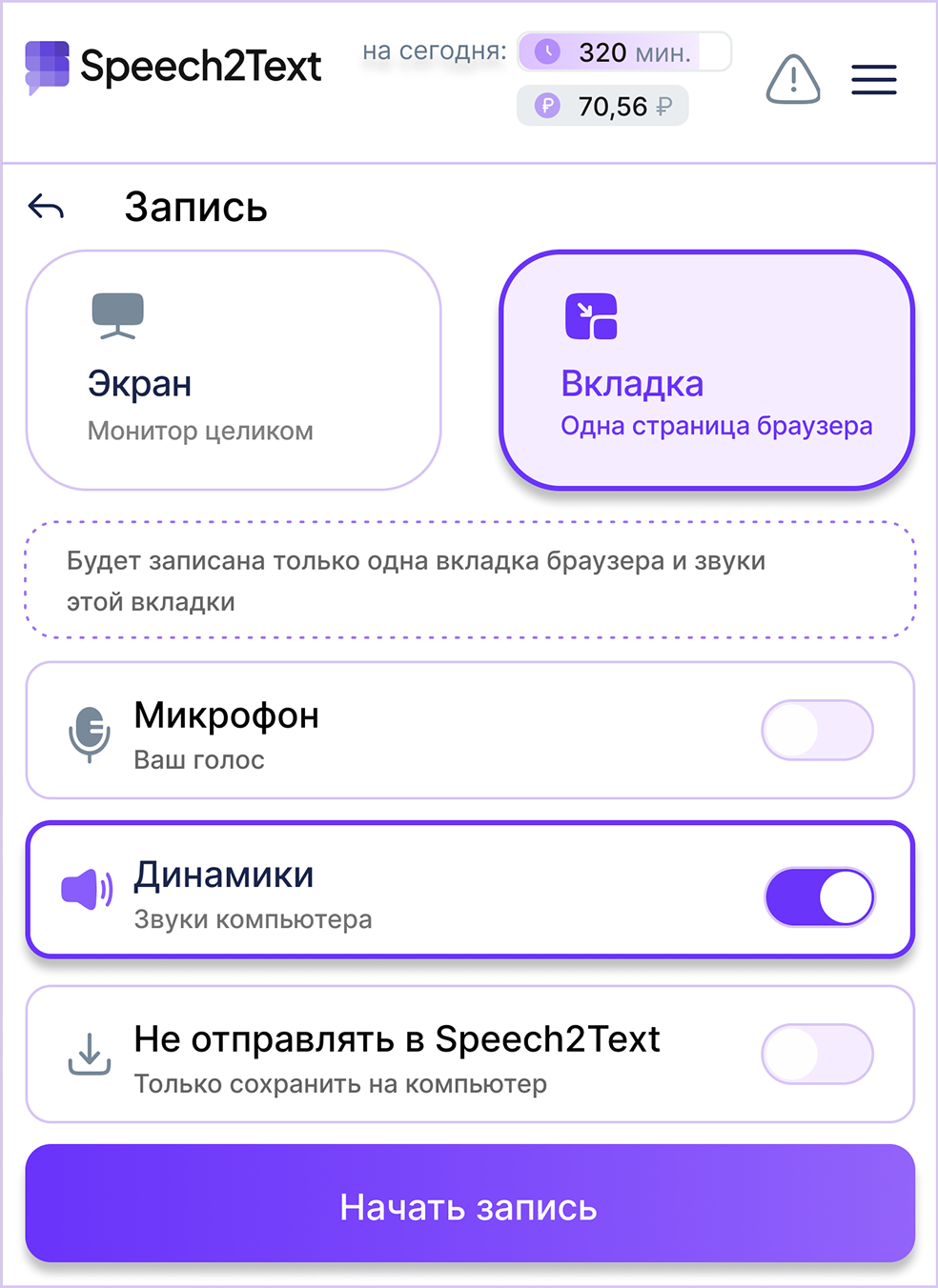 Кликните на значок Speech2Text на панели инструментов. Во всплывающем окне выберите источник записи: вкладку или весь экран; выберите источник звука: микрофон и/или системный звук. При необходимости настройте параметры сохранения записи: только на компьютер, либо с отправкой в сервис Speech2Text