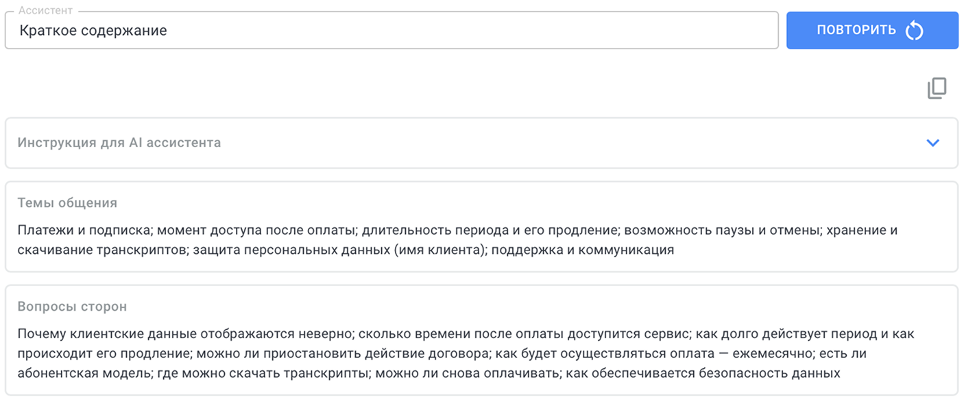 Результат: вы сразу видите, как прошёл разговор, что сказал клиент и где теряются сделки — быстро, точно и автоматически