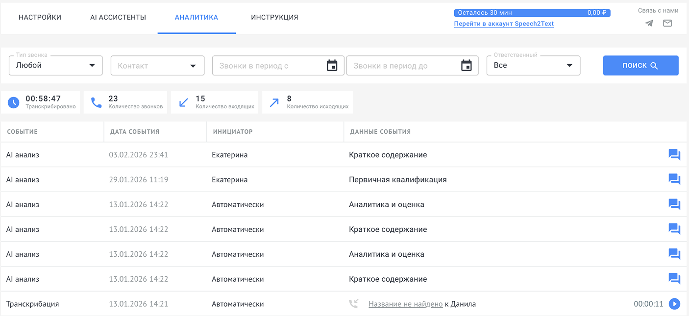 Speech2Text показывает полную картину работы отдела продаж: все звонки, транскрибации и результаты AI-анализа — в одном интерфейсе amoCRM